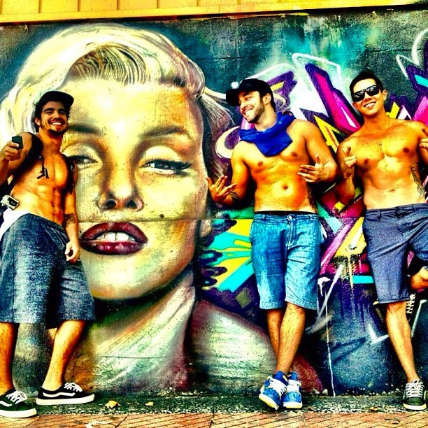 Caio Castro posou com amigos neste sábado, 2, em frente a um muro pintado com o rosto da Marilyn Monroe. No entanto, para muitas seguidoras do ator no Instagram, o maior detalhe da foto foi o tanquinho superdefinido que ele exibiu.